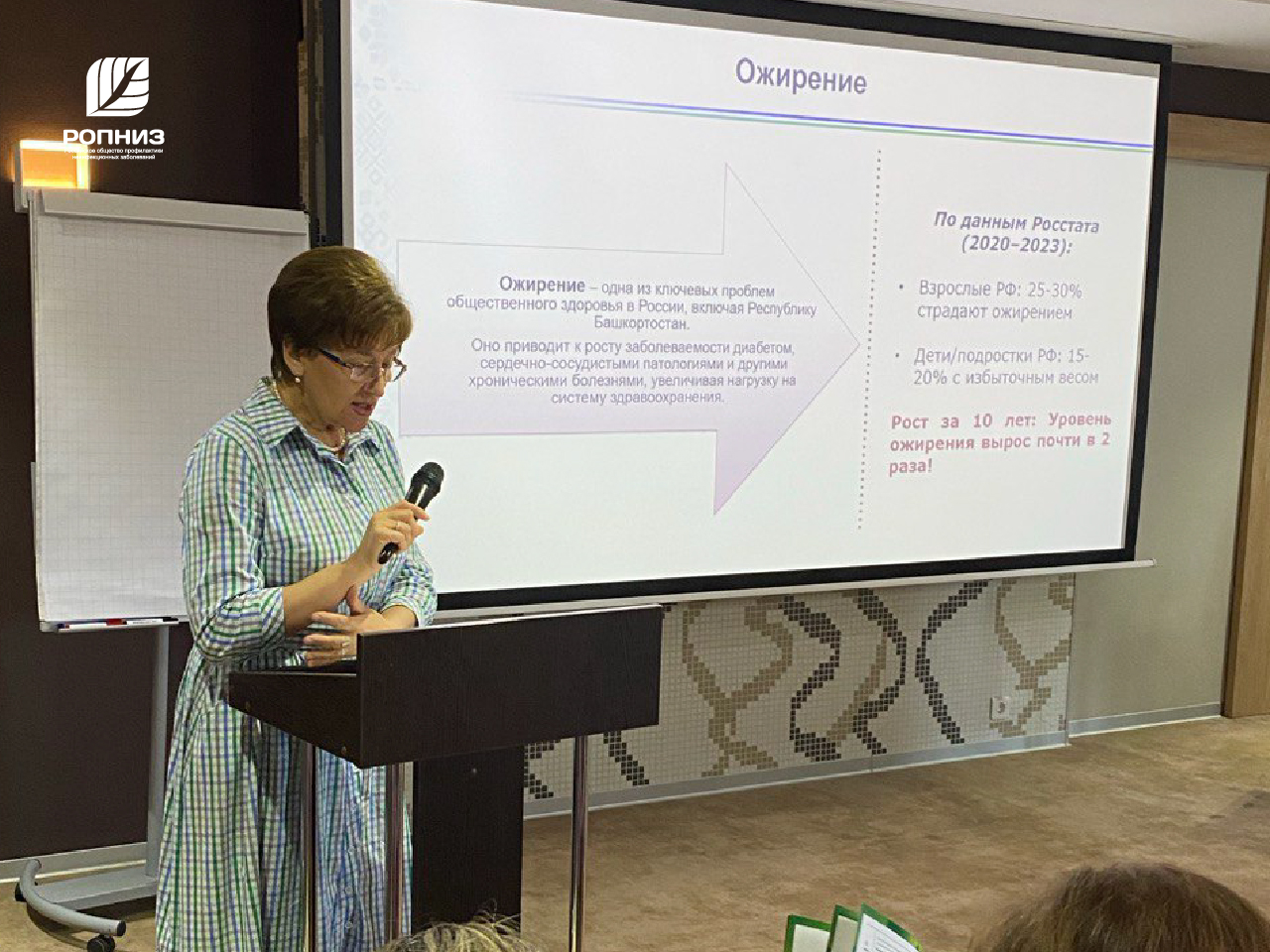 подчеркнула важность борьбы с ним. Главный внештатный специалист по медицинской профилактике Республики Башкортостан С.Х. Ахтямова представила ключевые моменты реализации в регионе проекта по профилактике ожирения. В дискуссии приняли участие и другие эксперты, в том числе Б.Н. Гарифуллин (ГВС по терапии и общей врачебной практике РБ), А.Д. Насыртдинова (ГВС эндокринолог РБ), представители республиканского Минздрава, А.В. Концевая, вице-президент РОПНИЗ по направлению «Общественное здоровье и здравоохранение», Е.С. Иванова, руководитель отдела координации профилактики и укрепления общественного здоровья в регионах ФГБУ «НМИЦ ТПМ» Минздрава России.